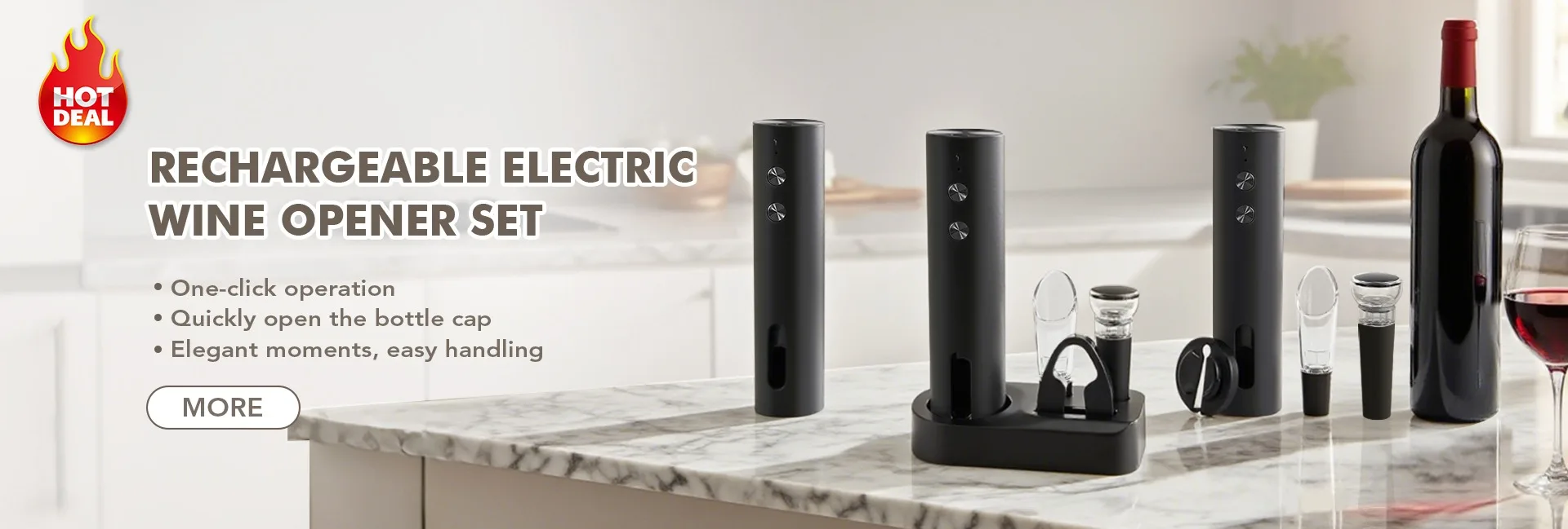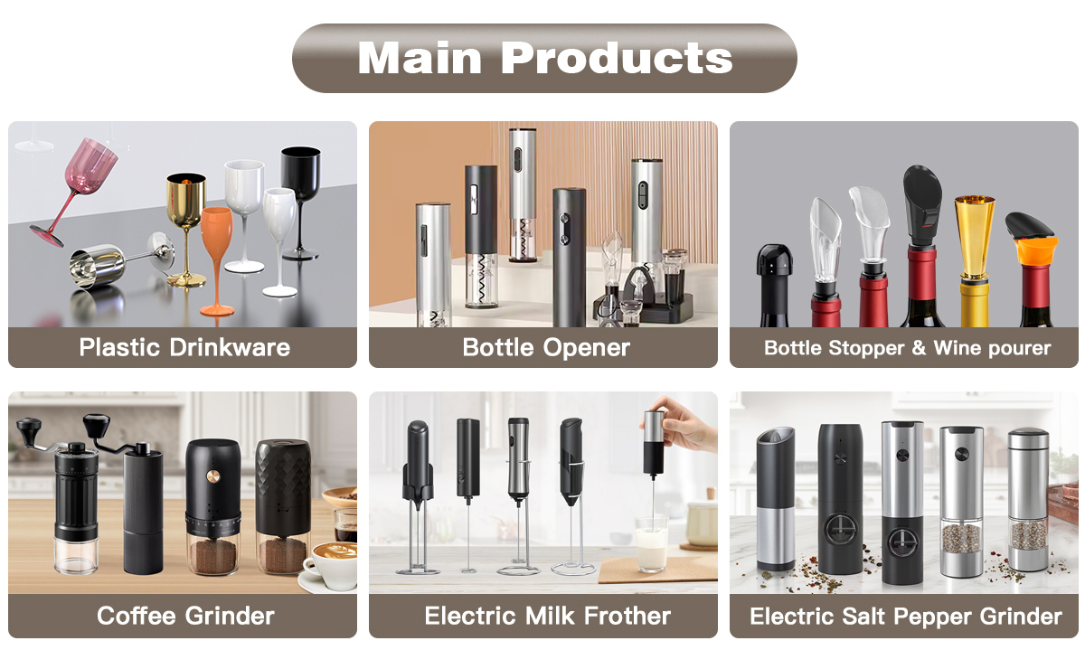 Productos principales:Abridor de vino eléctrico, Molinillo Eléctrico, tapón de vino de silicona, aireador de vino eléctrico, copa de vino de plástico